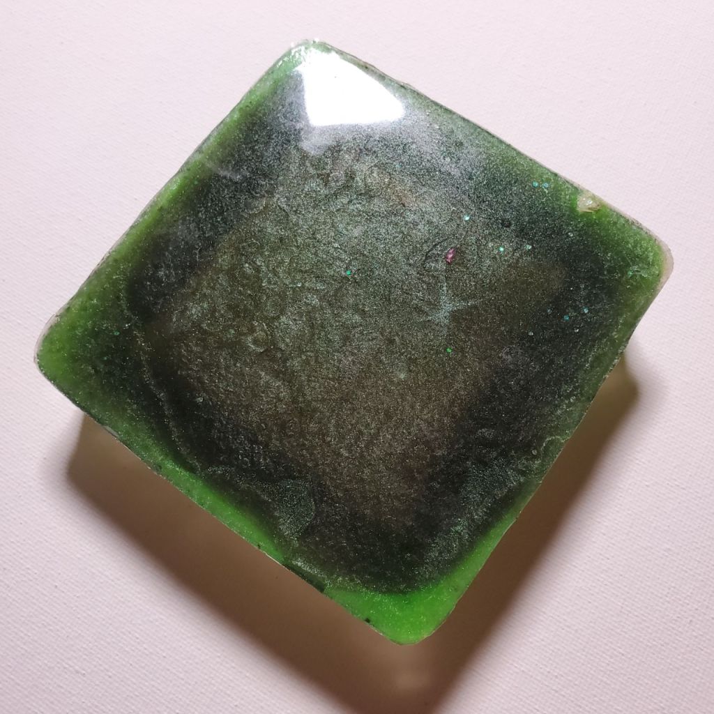 This is one of the most recent ashtrays I made. I put a few layers of green in this, and also little white flowers in the sides. The bottom is black and pearlescent.