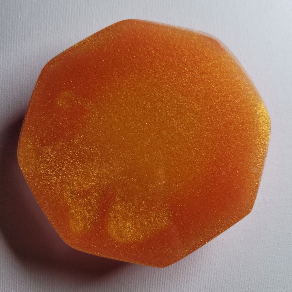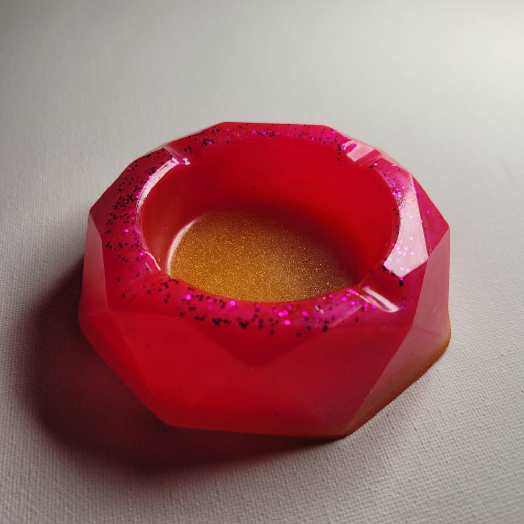 This is a pink and gold ashtray that I made. I put pigment into the gold, and alcohol ink and glitter into the pink. All of the glitter sinks, but I like how it turned out. I really love this one, mainly because I think that the colors go really well together and the pink is really vibrant.
