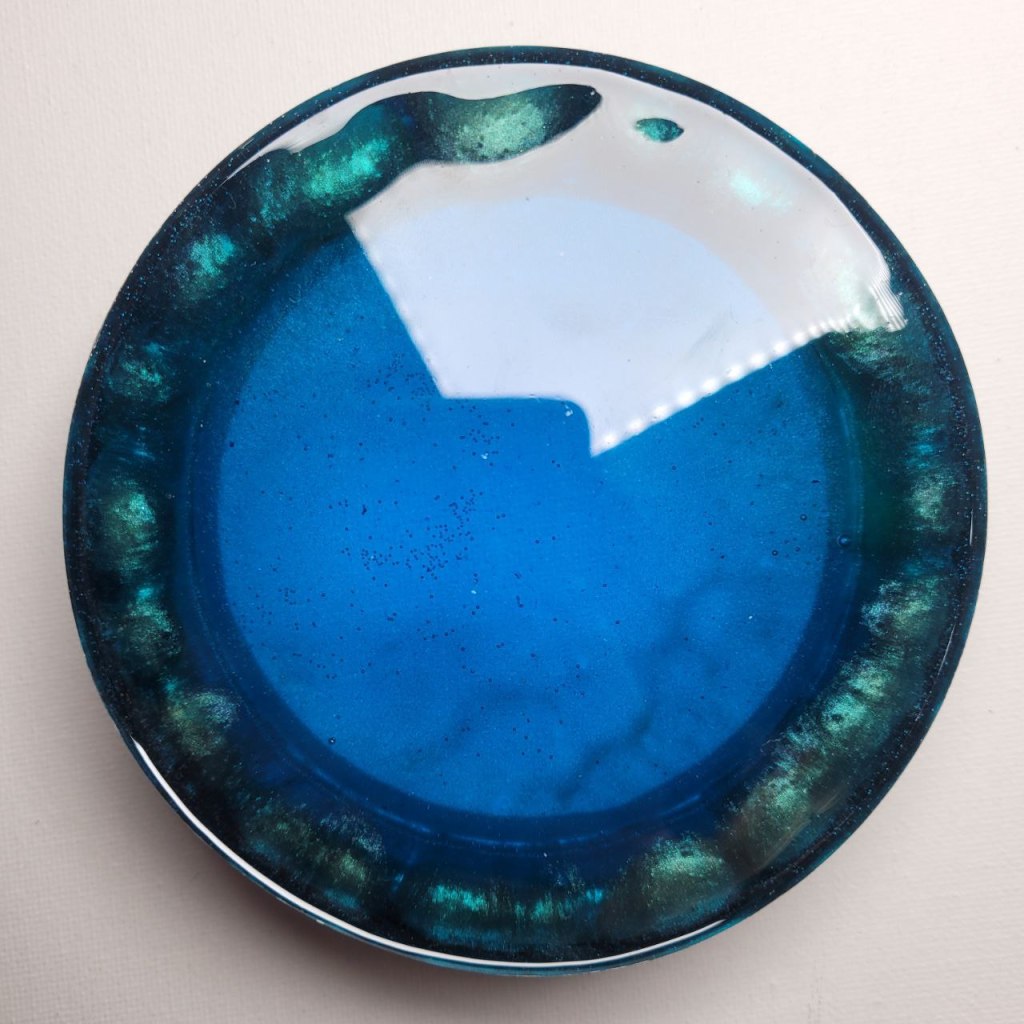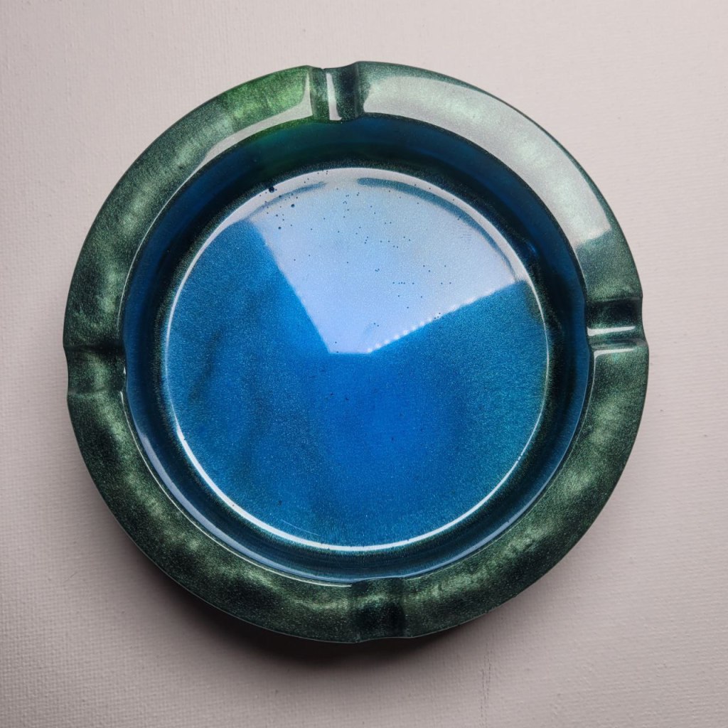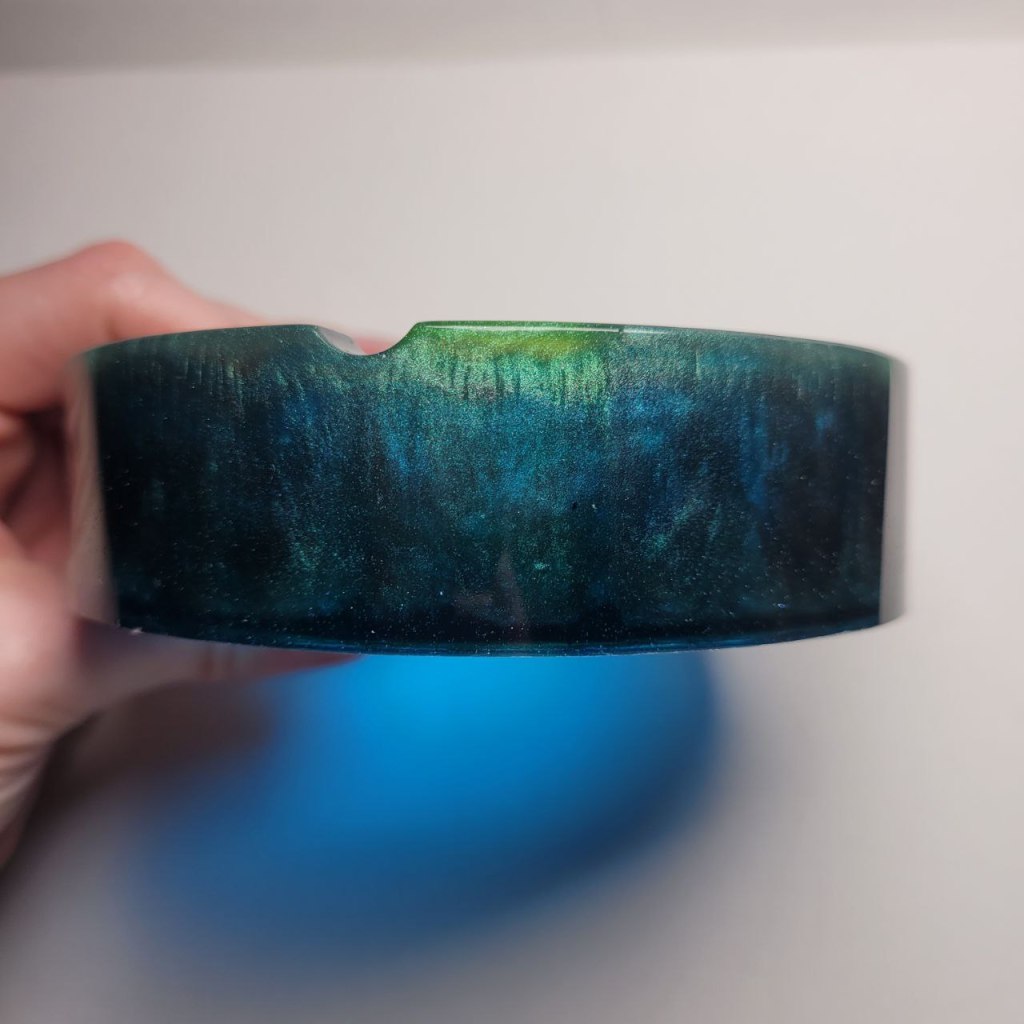 Even with this small mishap, I still really love how this ashtray turned out, especially the bottom and sides. I like how the green resin bubbles out into the blue resin in the bottom, and I like how all three colors blend in the sides.