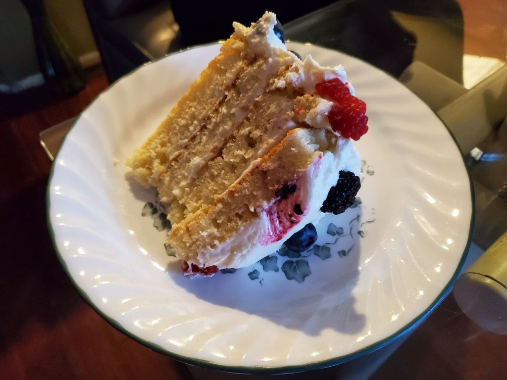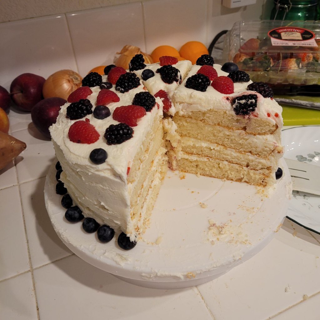 This was the first layer cake that I have ever made, and I love how it turned out! I am really proud of this. Before this, I have only made cakes that were one layer and were not fully frosted. I know that I can improve a lot in my making of layer cakes, but this was a great first start.