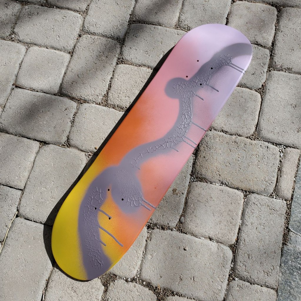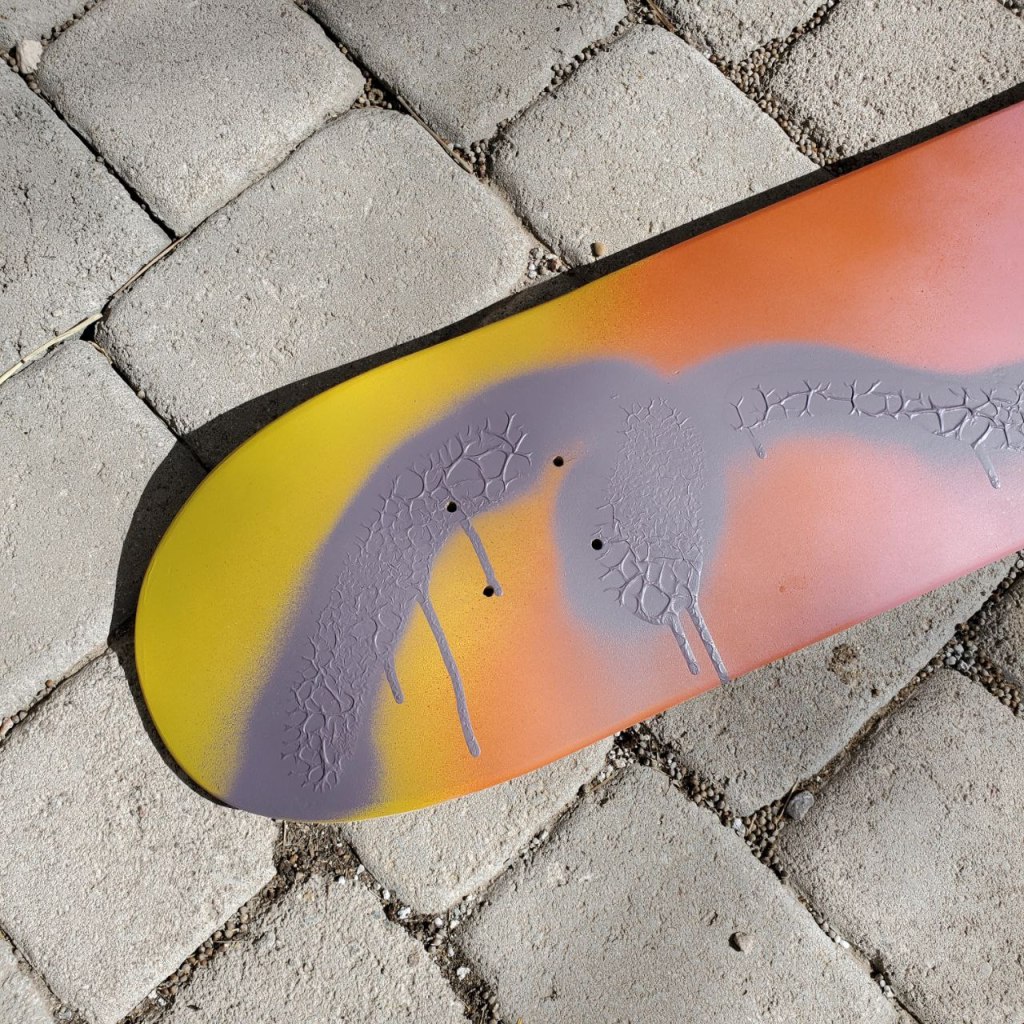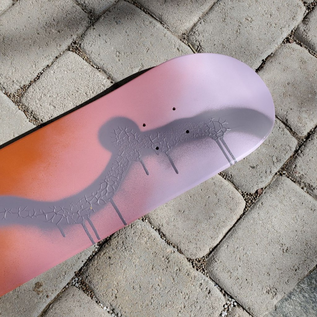 I started painting the background of this skateboard deck with spray paints, since I received a set of them for Christmas. I was super excited to start using these, since I know there are a lot of cool things that I can do with them. I knew basically what I wanted to do with the whole project from the beginning.