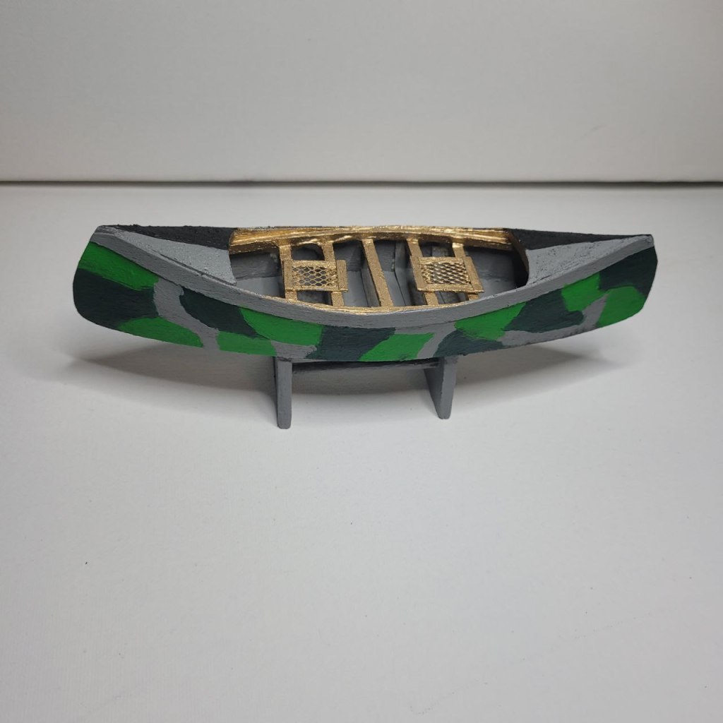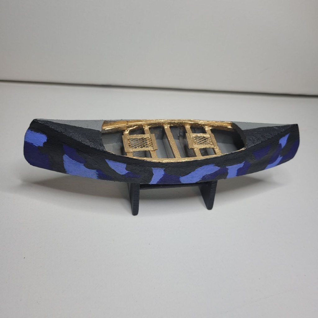 On the sides, I painted all of the main body of the boat a medium brown color, and I painted all of the trim on the boat white. I had to do a couple of coats of white because the brown bled onto it in some places. After this all dried, I painted the stand all black so it blended in with the surroundings of the boat, wherever I put it.