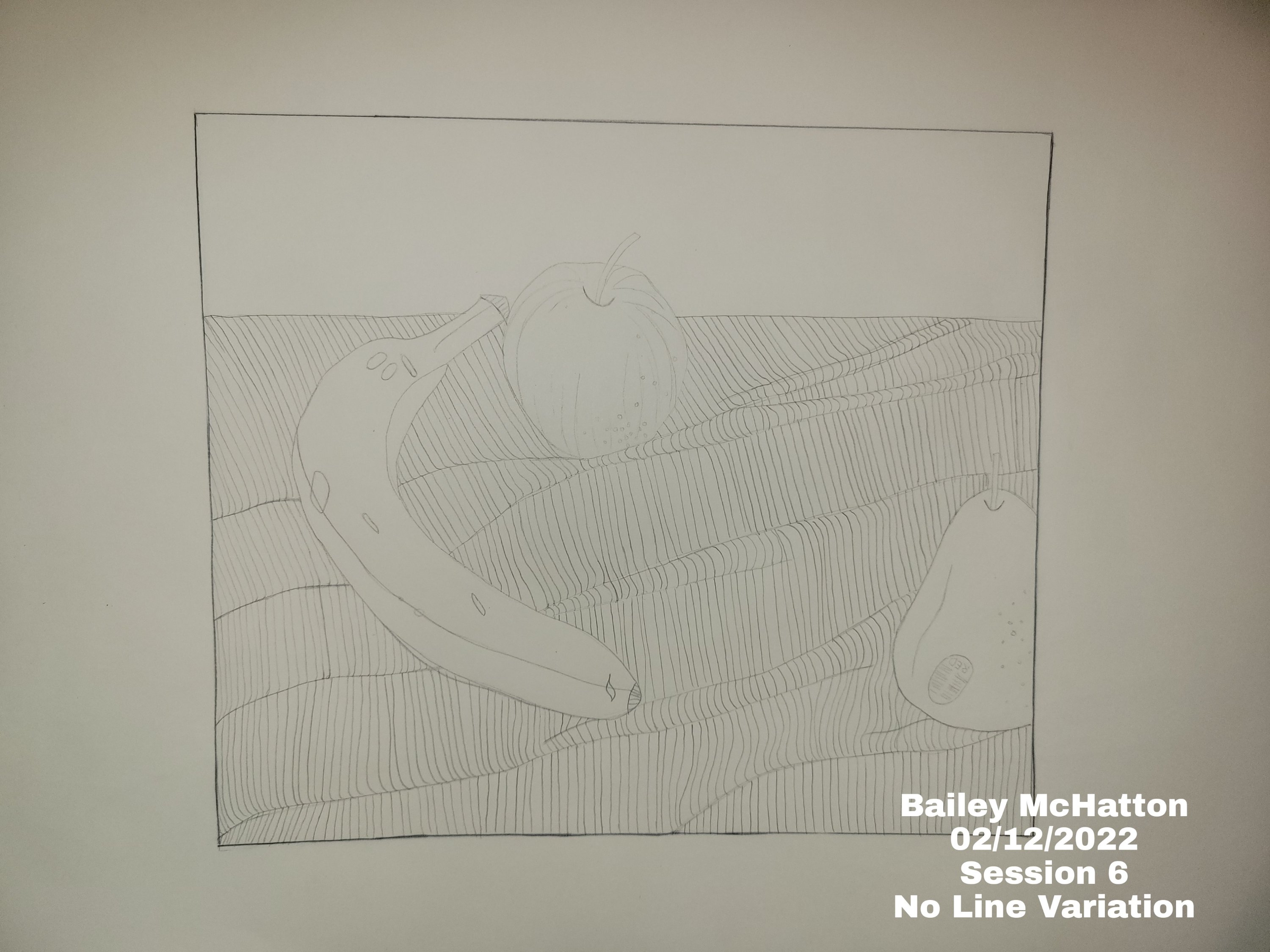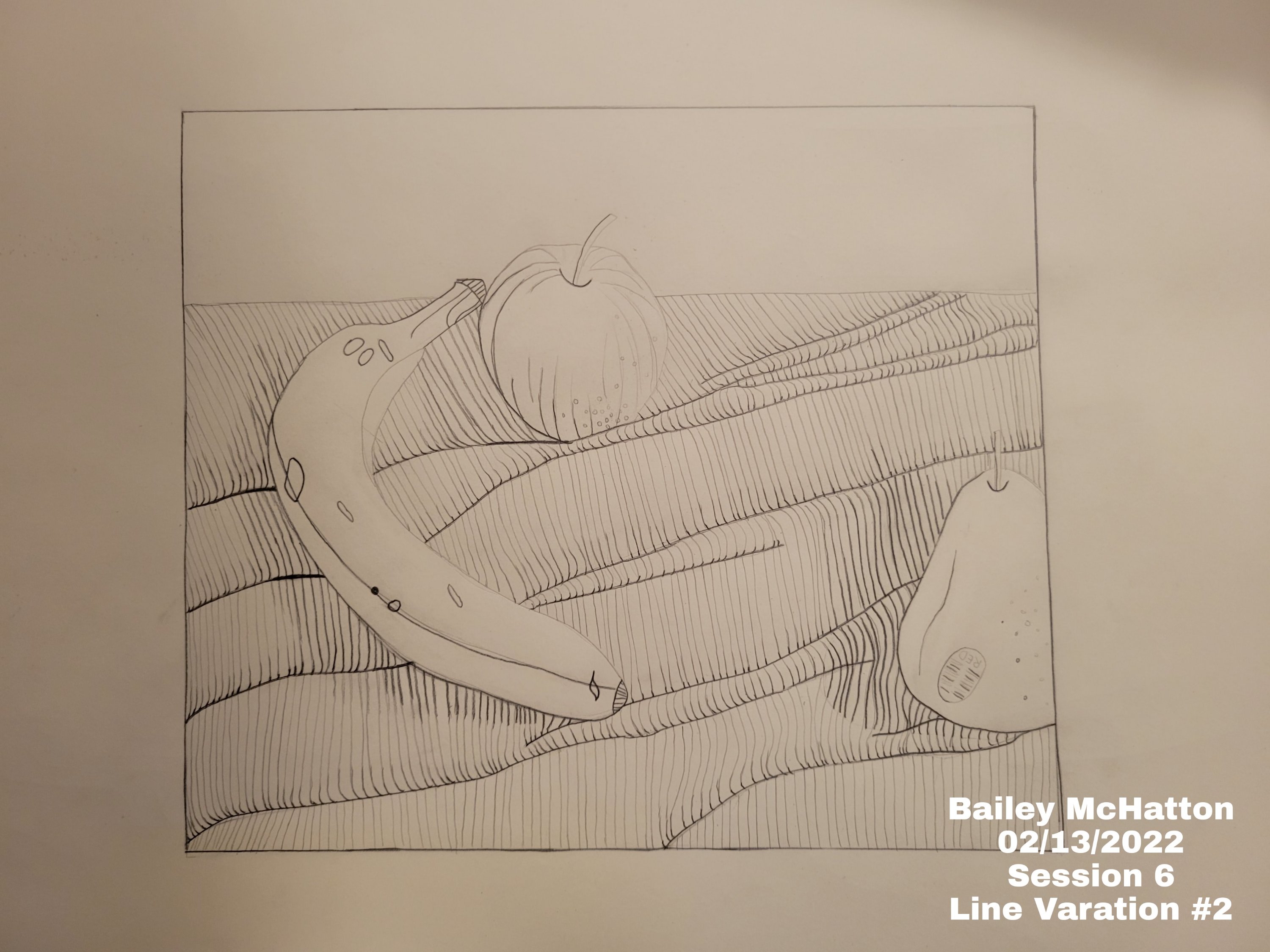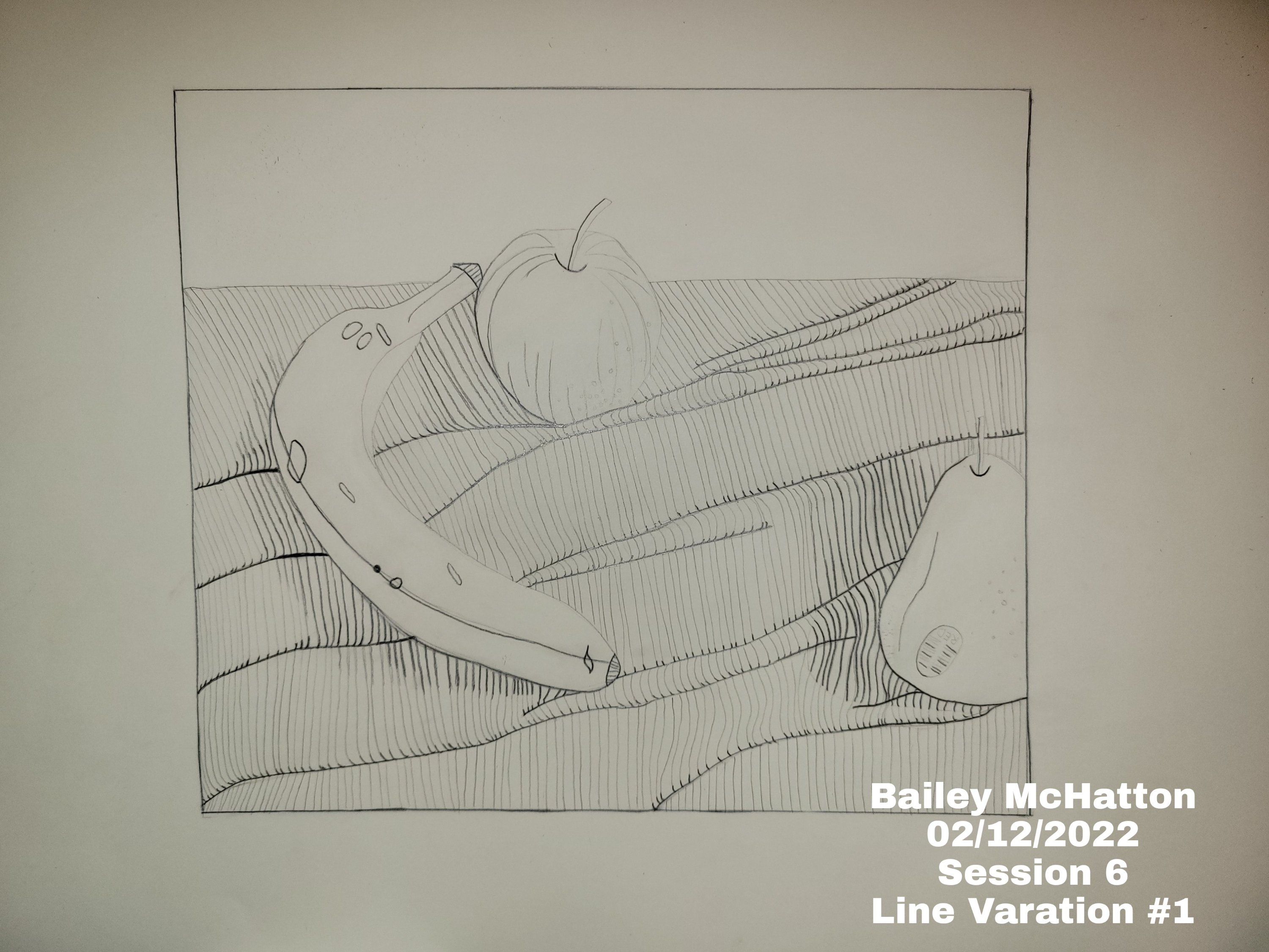 This session was about bringing together most of what we had learned so far. Still life, fabric, and line variation. We were supposed to find a few fruit items and put them on a piece of fabric with a few folds in it, and then photo document the process of doing it.