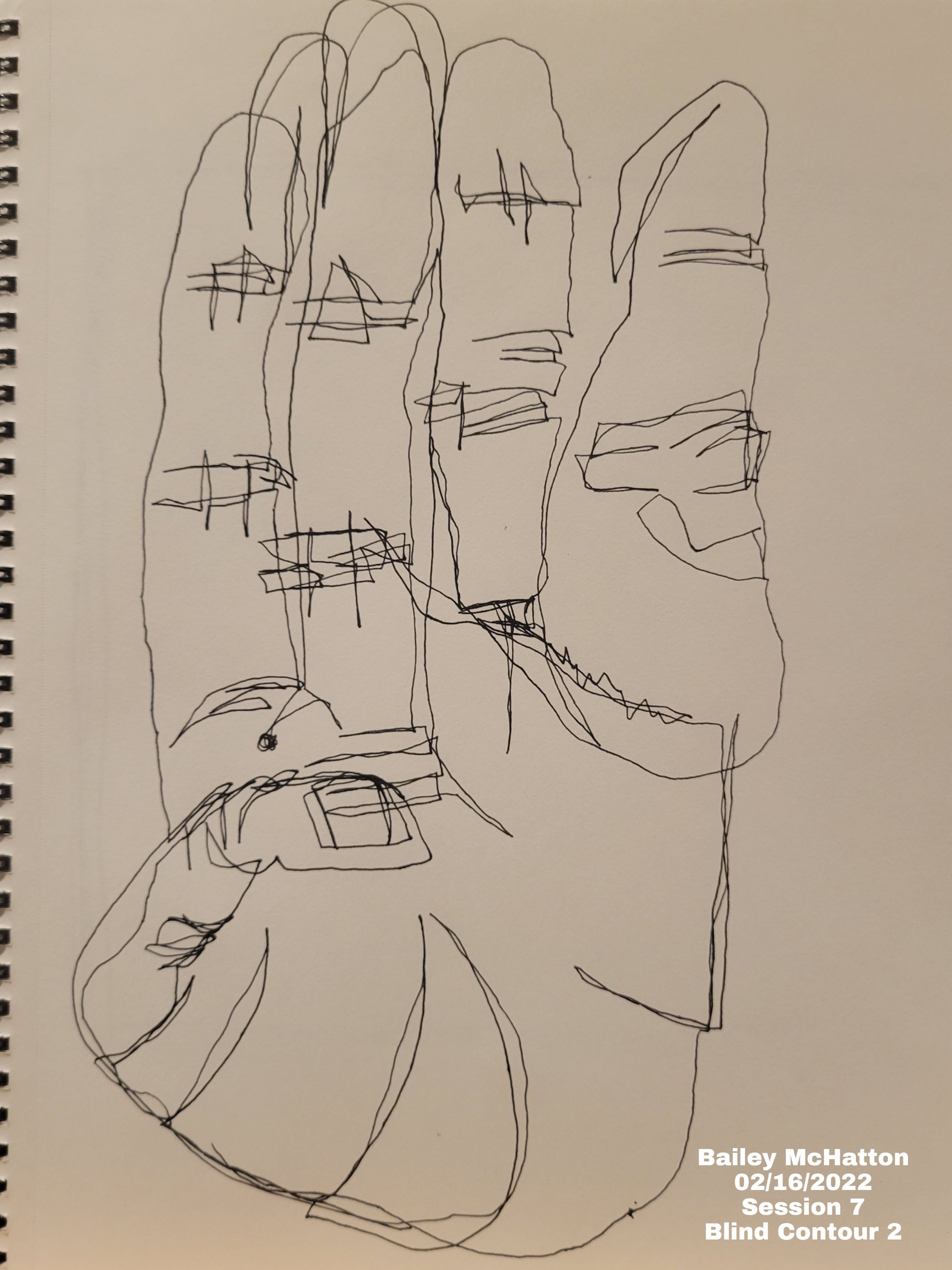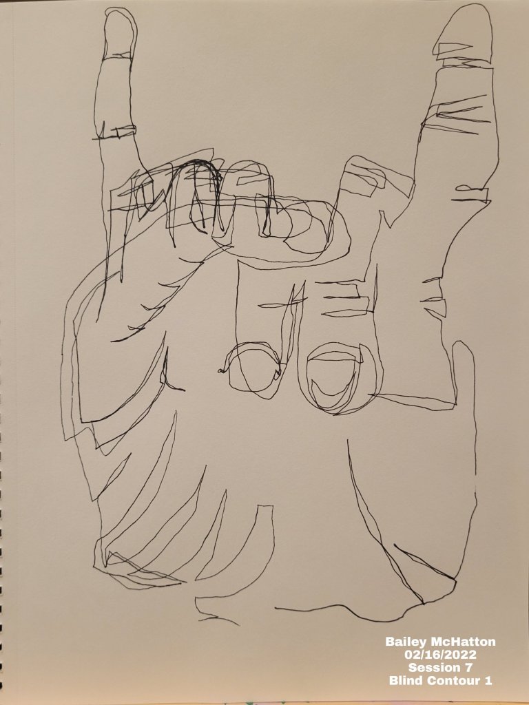 First, we had to do 2 more blind contours to get ourselves ready to draw. We did our hands again, in 2 different poses. I did the “rock on” pose and the letter b in American sign language. I really like doing these blind contours, and I’ve also really enjoyed seeing how I’ve been progressing with them.