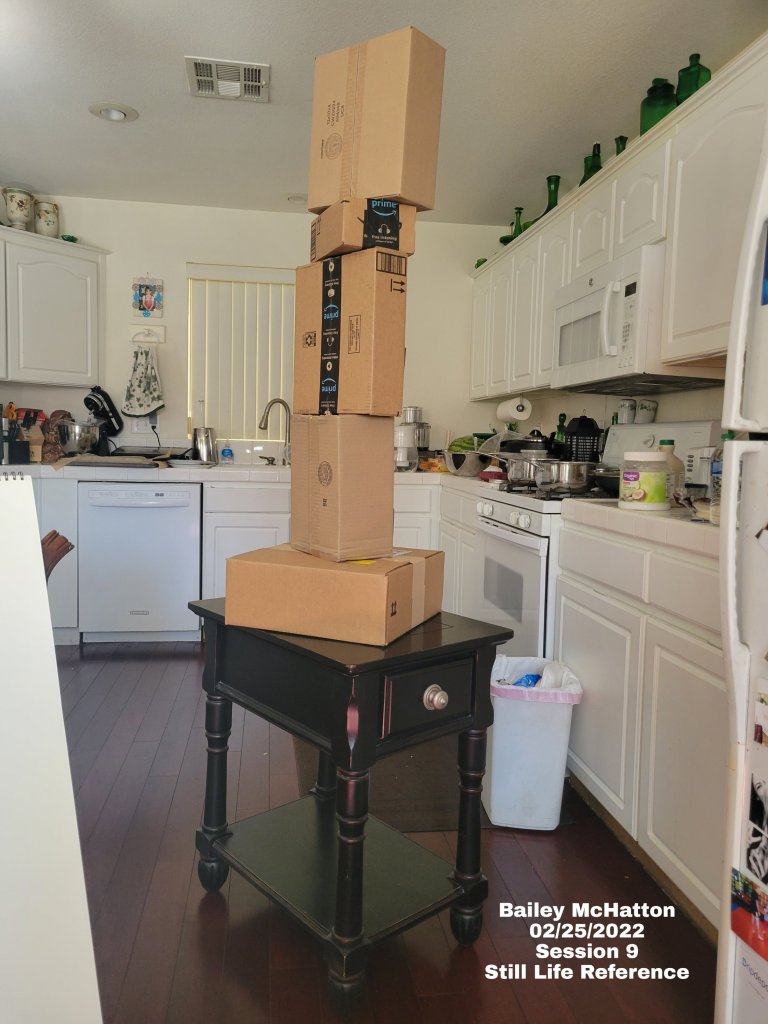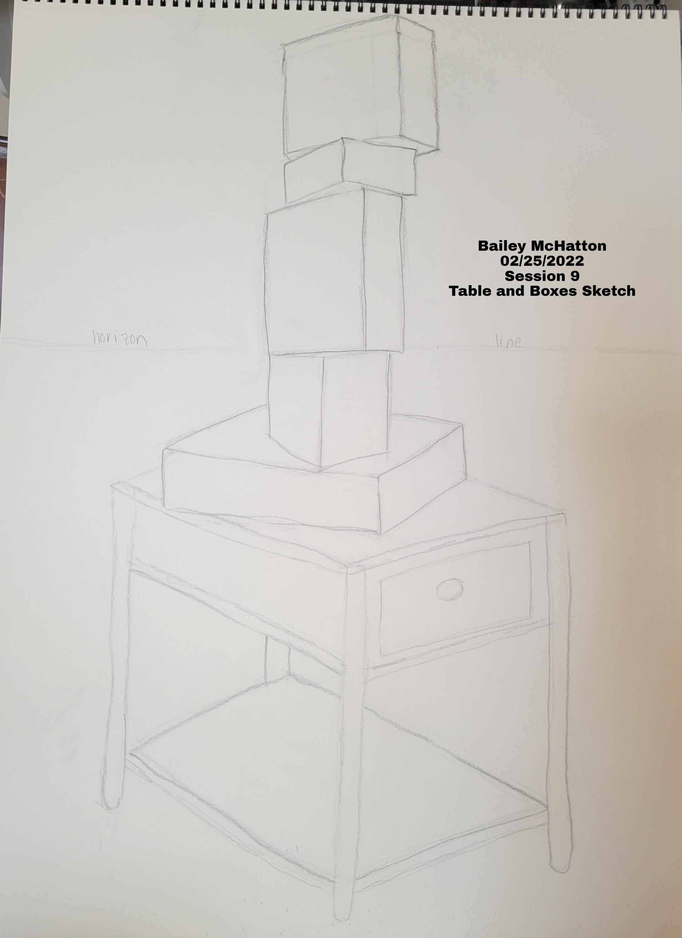 I also drew out proportion lines of all the boxes and the table before drawing anything to help the proportion be more accurate. These are also visible in the picture below.