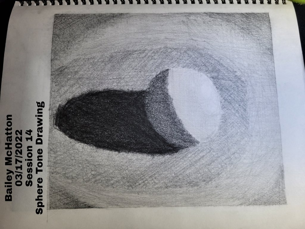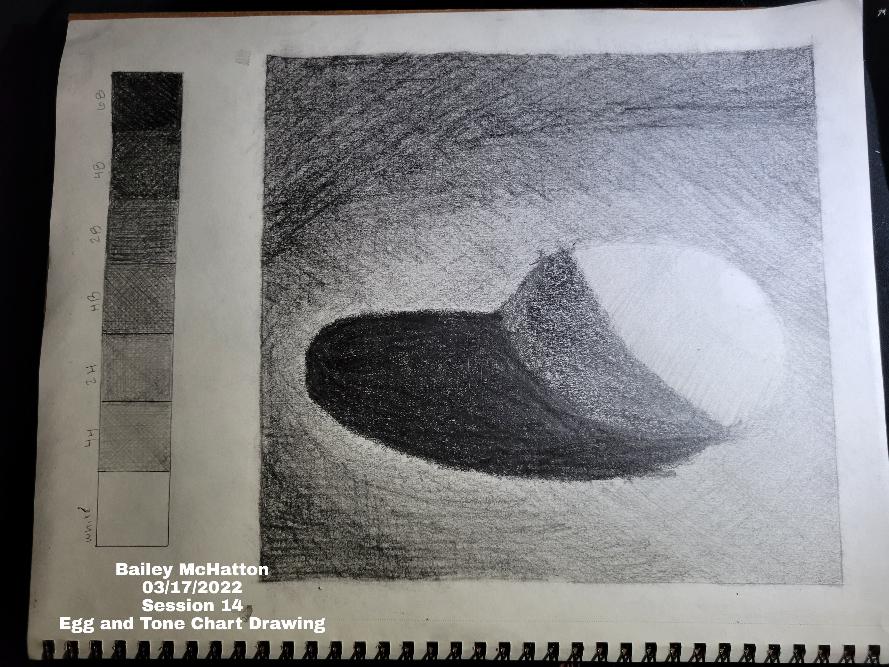 The shading outside of the egg is a lot better than the tennis ball. I had a hard time making sure the highlight on the egg wasn’t covered by accident. On this one, we also had to make a tone chart on the side of the paper. That was probably the easiest part of the session.