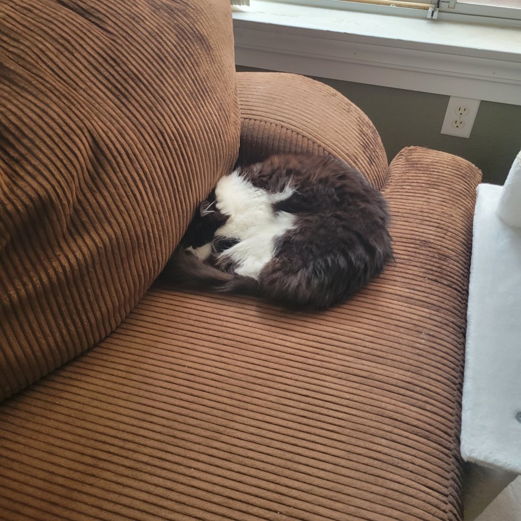 Here he is sitting on the couch. So cute. He will only sit on the couch with us if he is as far away from us as possible.