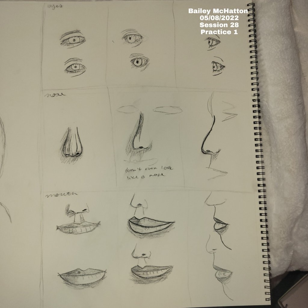 For this session, we first had to do some practice of different facial features including eyes, the nose, and the mouth. These all turned out surprisingly well so I had relatively high hopes for the rest of the session. I do know that I need more practice, but I think they turned out really well for what they were.