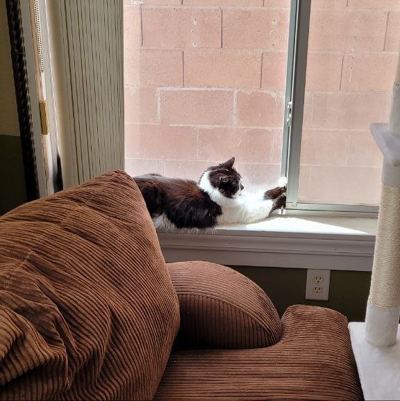 Here he is sitting on the windowsill with his little feets up. He only does this sometimes and I go wild for it I love it so much.