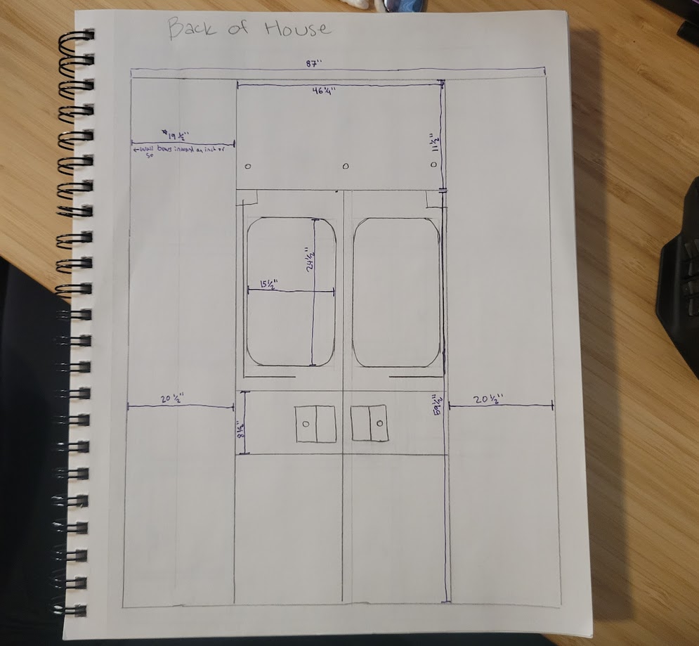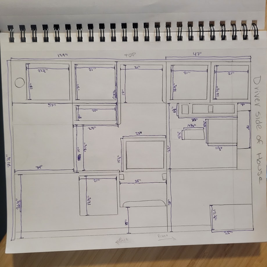I have drawn diagrams of all sides of the ambulance, inside and out, and have measured about half of them completely. I have not measured the ceiling, or any of the outside yet. My fiance has been helping me record all of the measurements, and he has been a great help. I have wanted to do this for a while, because sometimes I am not at the ambulance, but trying to plan something, and I don’t know the exact measurement of something that I need. This has already solved that problem several times.