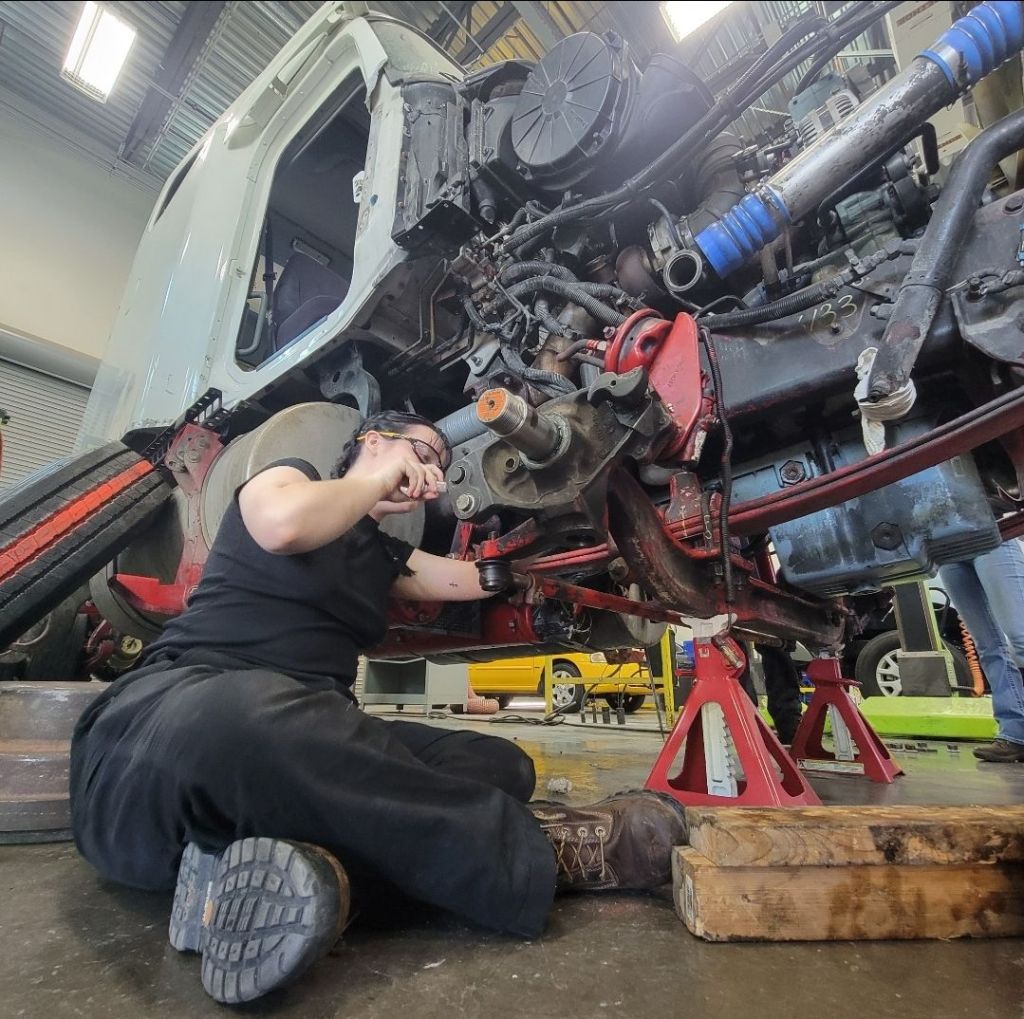 Me working on a kingpin at diesel mechanic school.